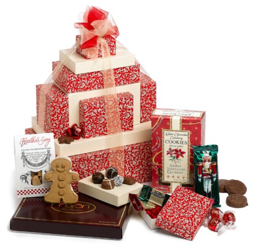 This classic 10-layer holiday tower contains a variety to holiday treats that are fun and satisfying for all ages. For chocolate lovers, the tower contains eight ounces of assorted chocolates, six chocolate covered sandwich cookies, eight red foil covered stars, one bag of dark and one bag of mint-filled Ghirardelli chocolate squares(4.87 ozs each), and eight Lindt chocolate balls. Also included are two shortbread nutcracker-shaped cookies, one holiday gingerbread man, six ounces of caramel popcorn, one four ounce box of chocolate chip biscotti, spicy cocktail nuts (1.5 ozs), and cranberry cookies (7.0oz).CHECK PRICE NOW! PRICE DROP VERY FAST! GET DISCOUNT PRICE ON SALE