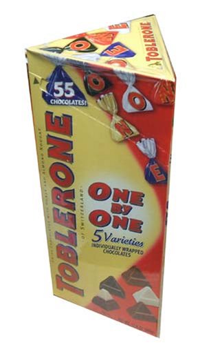 Toblerone One By One Assortment Pack 55 Count. A beautiful assortment of individually wrapped Toblerone chocolates. Toblerone is delicious Swiss chocolate with honey and almond nougat. Product of Switzerland. 5 Assorted varieties including Milk Chocolate, Dark chocolate, white chocolate, prailine chocolate, and a "snowtop" chocolate. Kosher with the "circle K" symbol. Makes a beautiful gift!CHECK PRICE NOW! PRICE DROP VERY FAST! GET DISCOUNT PRICE ON SALE